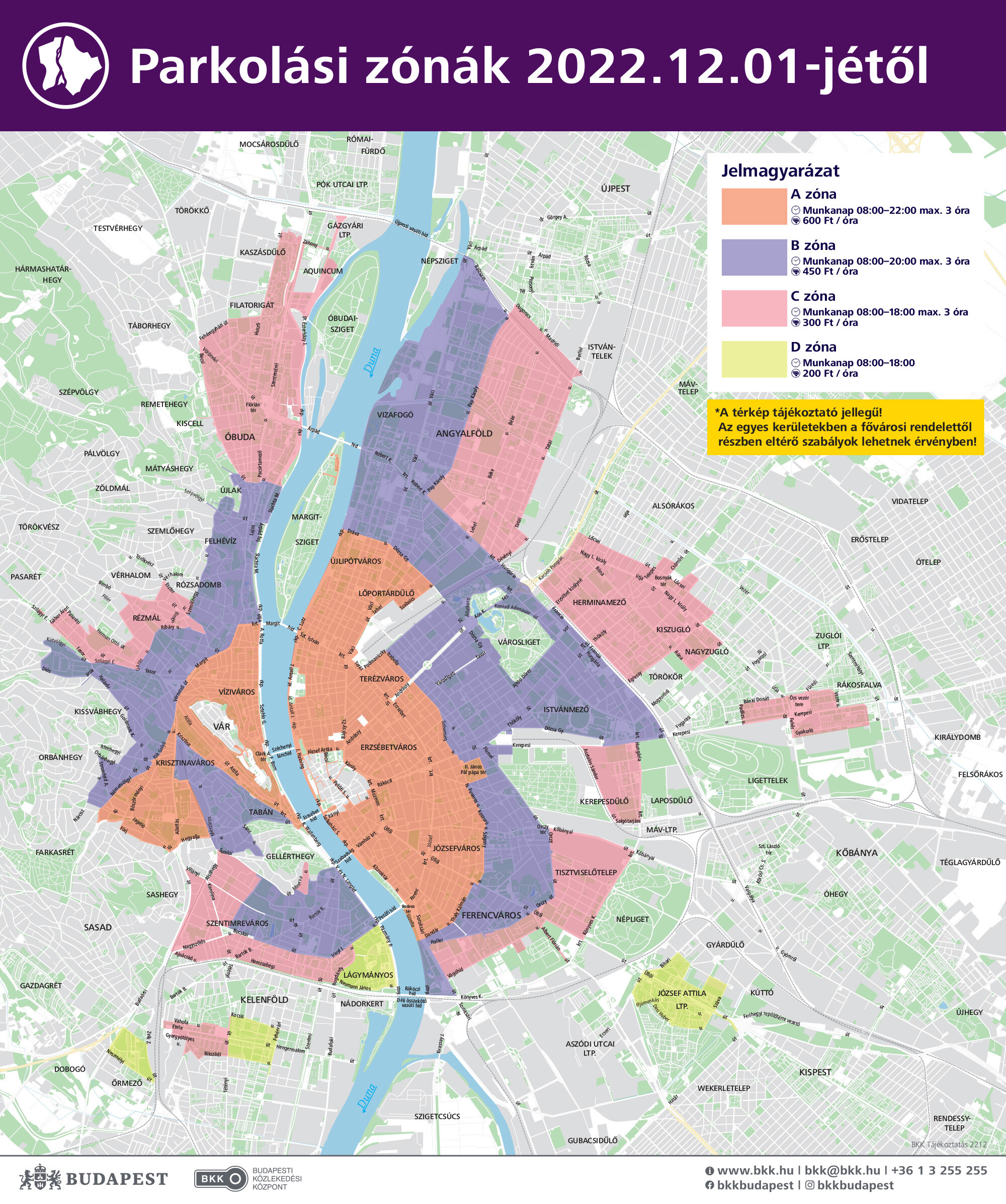 - Zone A : In the "A" zone, the amount to be paid per hour is HUF 600 , and the fee must be paid between 8:00 a.m. and 10:00 p.m. The maximum waiting time is 3 hours.